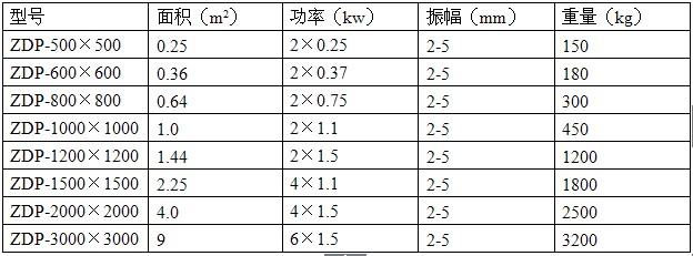 注:此表為上、下振形式振動平臺技術參數(shù),僅供參考;此外可以根據用戶實際使用需要定做臺面大小來選用振動電機數(shù)量及功率。